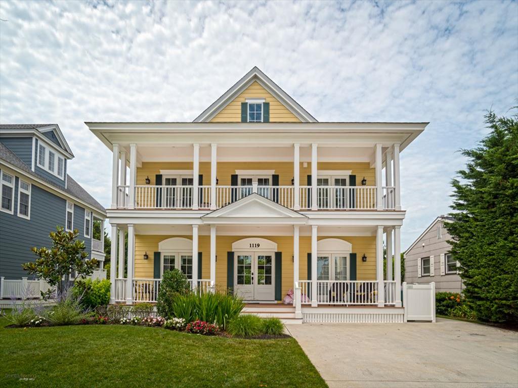 This is a grand home with multi-level balconies and porches including screened porches. The floor plan is open and the decor is bright. Rich hardwood floors are throughout. The first floor has a wide entrance hallway with the kitchen to the left and a turned staircase the the right. The family room is in the right rear corner of the first floor. The designer kitchen has a breakfast bar with 5 bar stools. It is open to the large dining room with a table with seating for 10-12 people. A two sided fireplace divides the dining room and the family room.(Fireplace is not available for use in warmer months.) The family room has lots of seating and a flat screen TV. Two TVs have You Tube TV, the one in the living room and the second floor