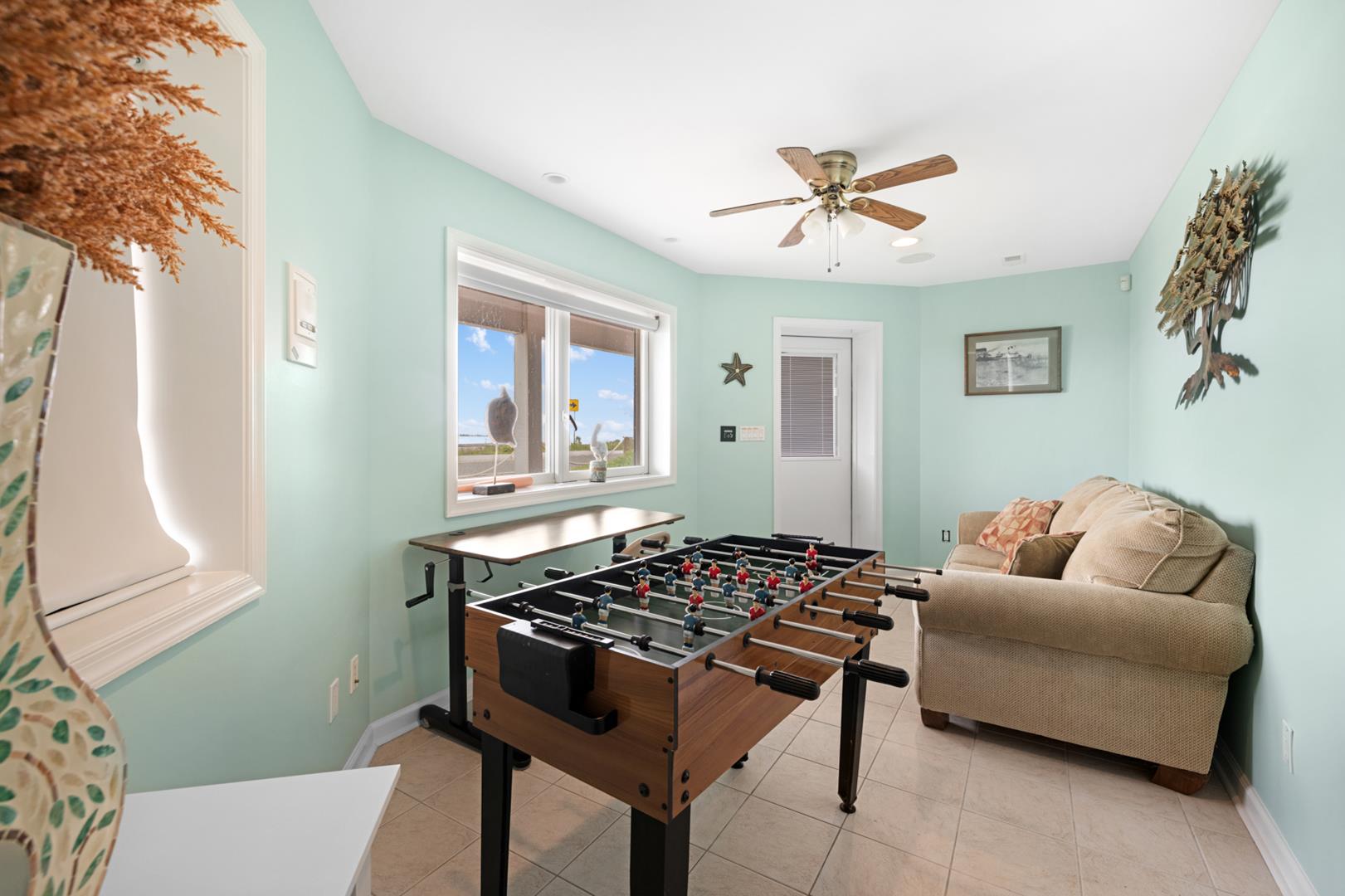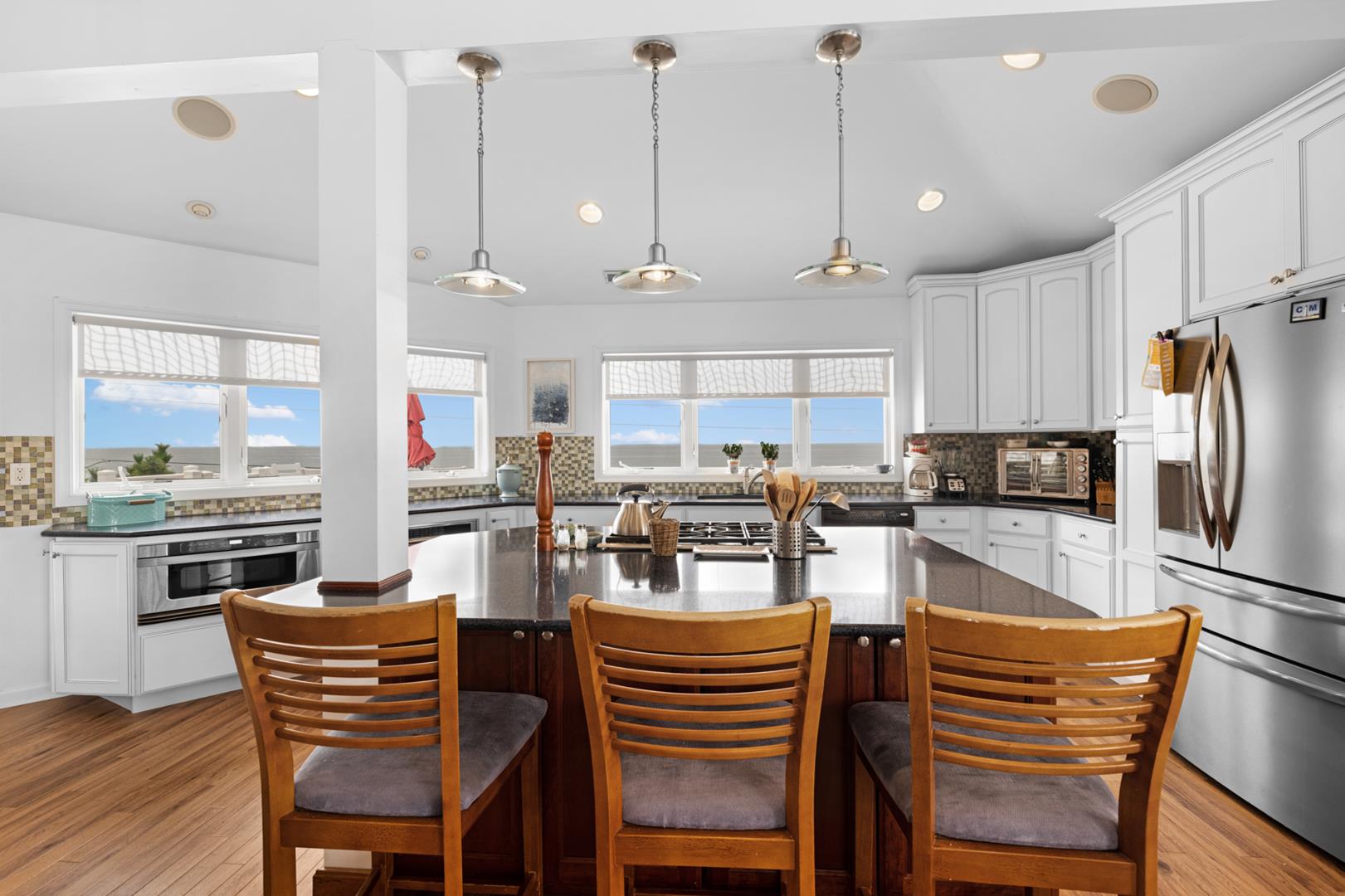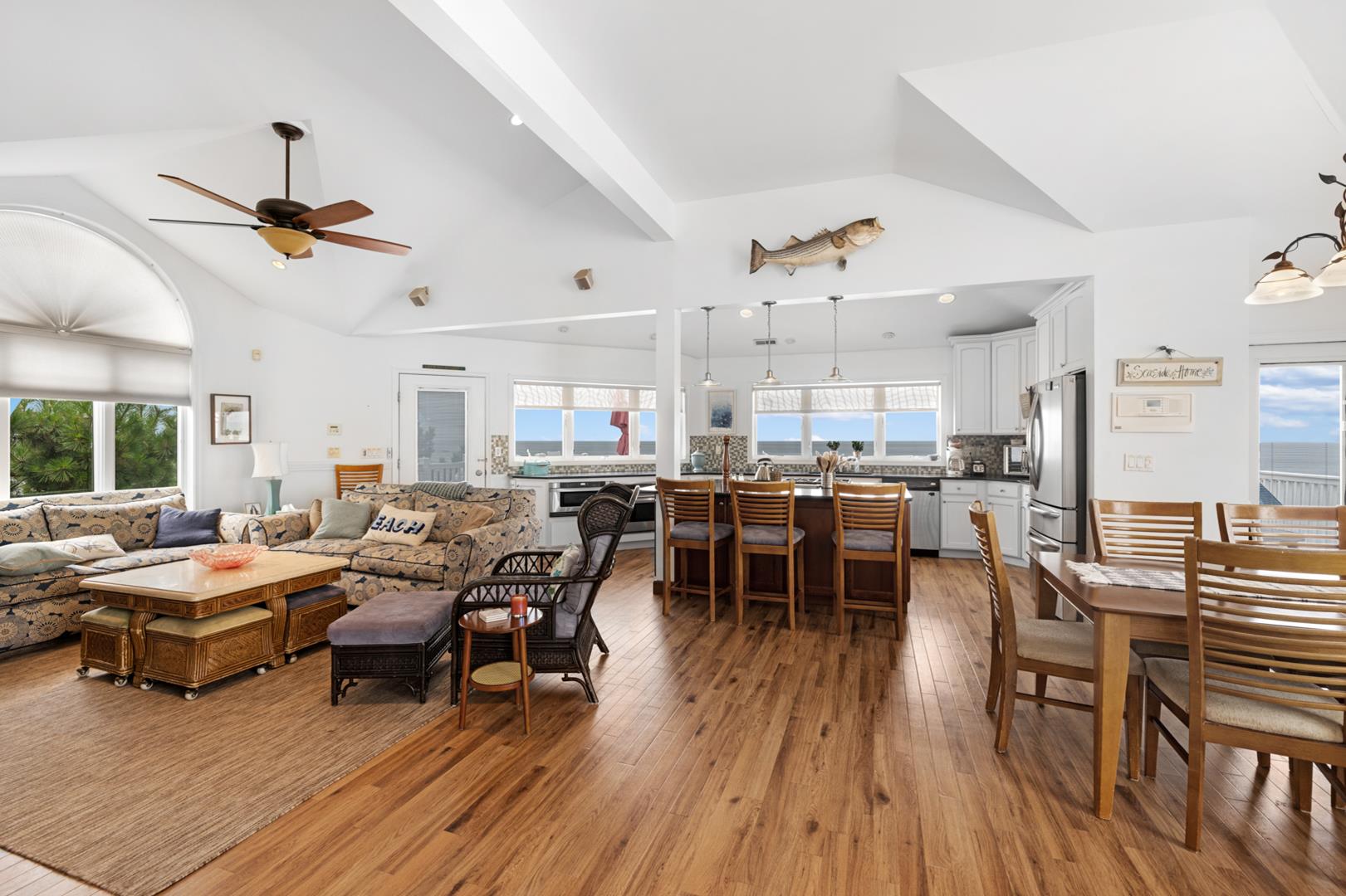 The third floor is home to the open chef's kitchen, dining area, living room, powder room and a primary suite. There is a huge open deck facing the beach with a natural gas grill. There is a separate entertaining area one the ground floor which is ideal for children and young adutls to enjoy, There are two bedrooms and a full bath on the ground floor. The second floor offers a primary suite and two additional bedrooms and a shared hall bath. There is an enclosed hot tub room. All floors have a full bath. There are two enclosed outdoor showers and a ton of beach toys and equipment. The best feature is immediate beach access!