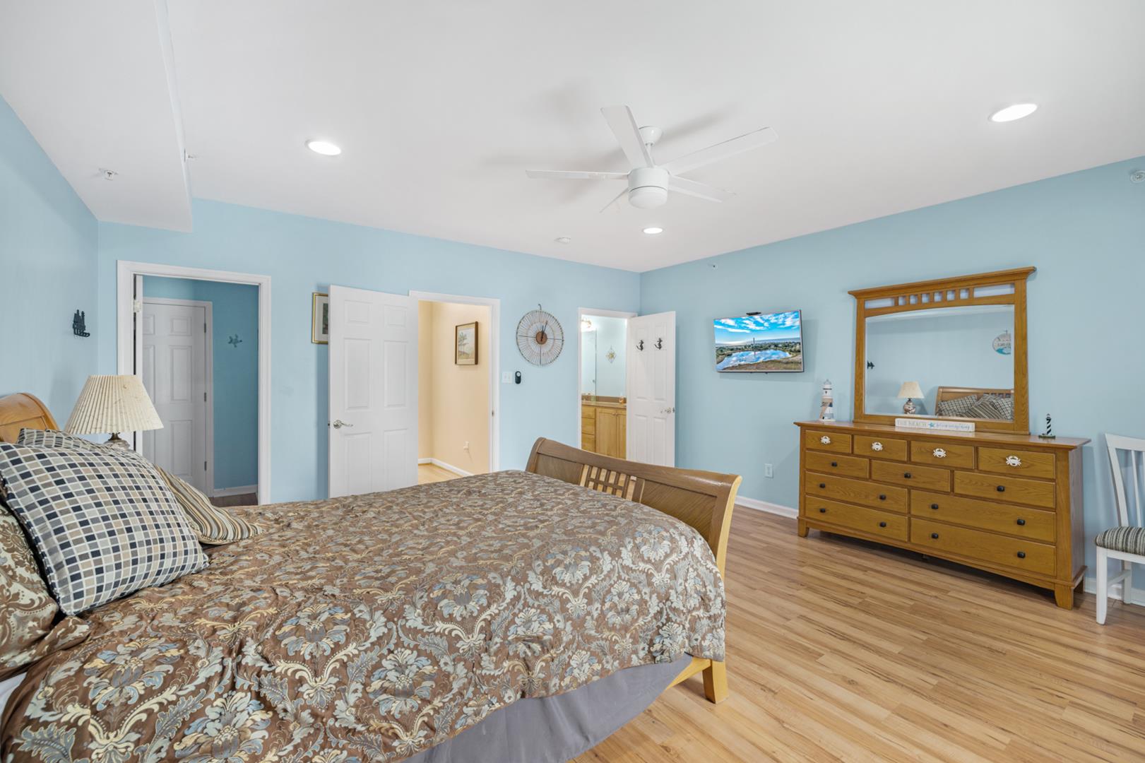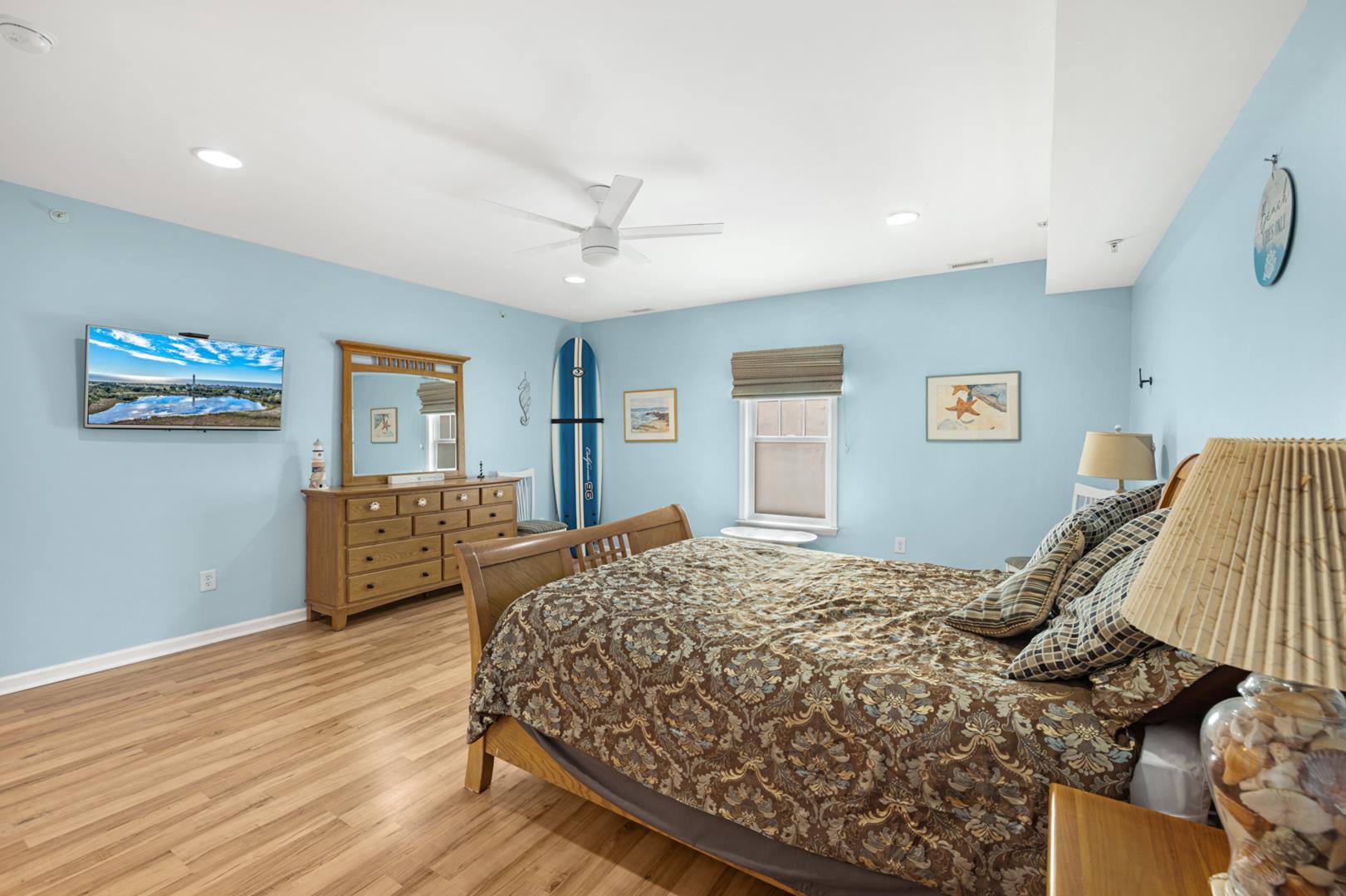 Relax in the central air-conditioned living spaces, complete with ceiling fans for added comfort. Entertainment options abound with 5 TVs offering cable channels, perfect for unwinding after a day at the beach. Step outside to enjoy the fresh sea breeze on one of the two decks, furnished with deck furniture for al fresco dining or lounging.