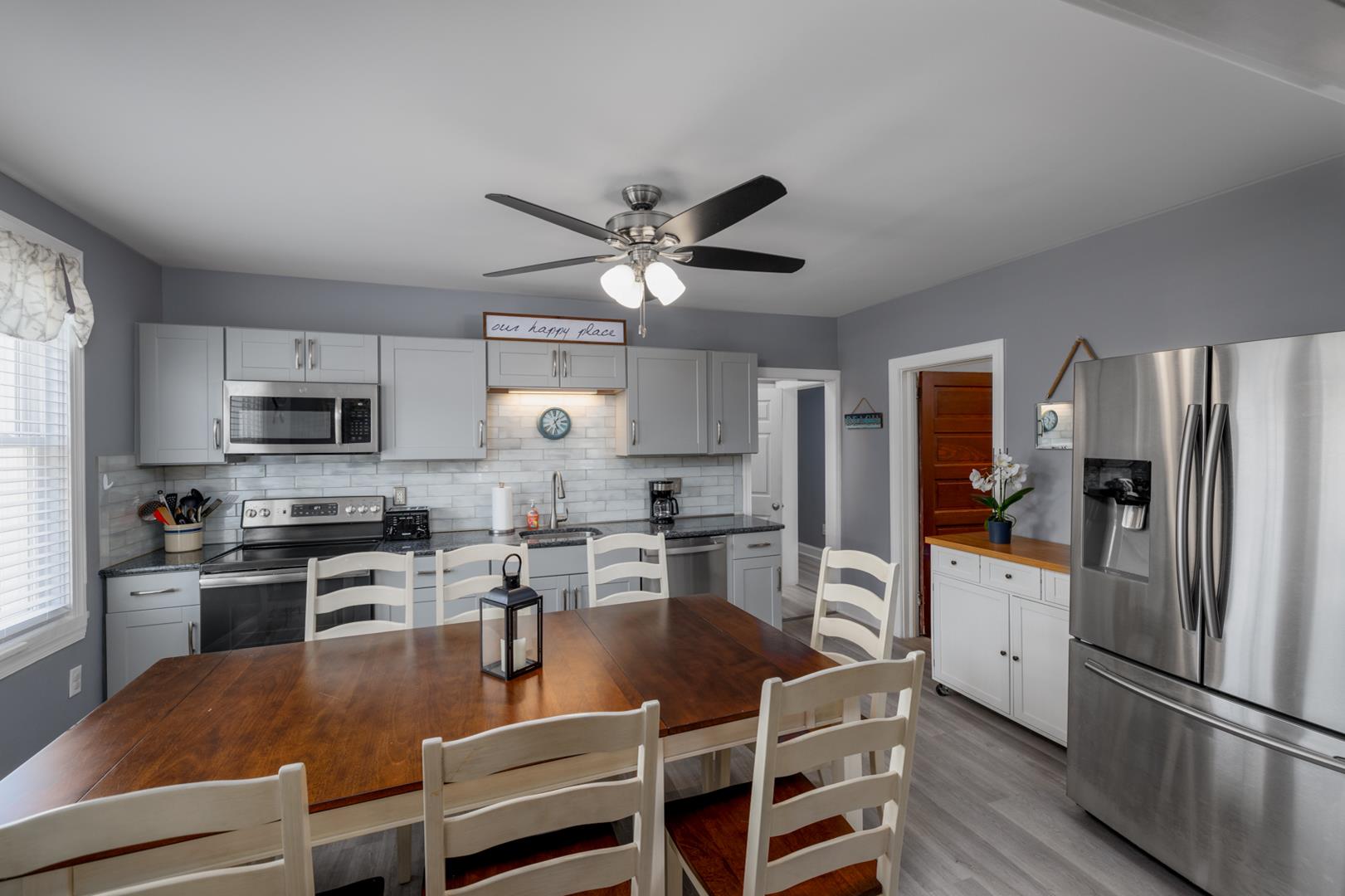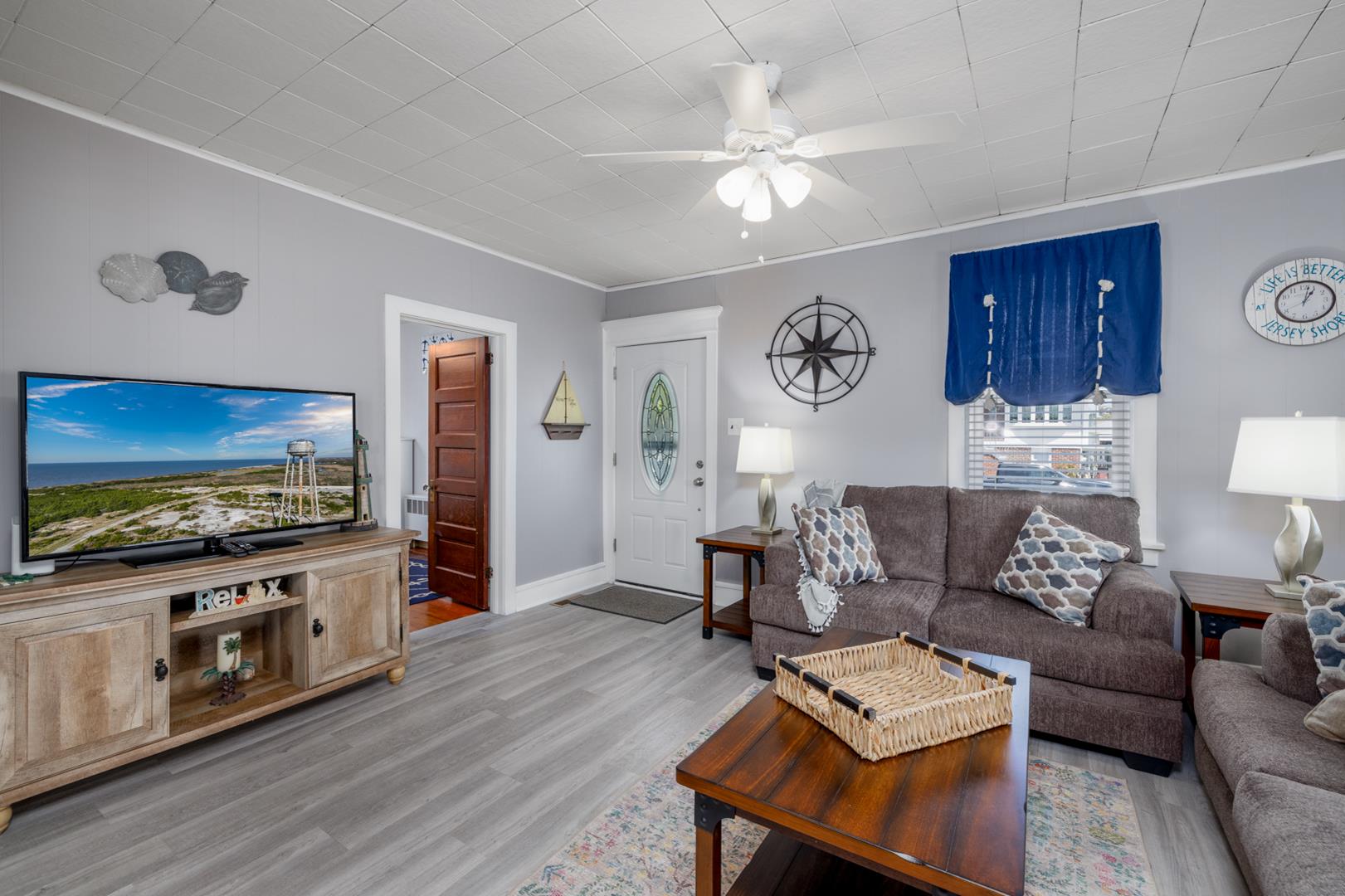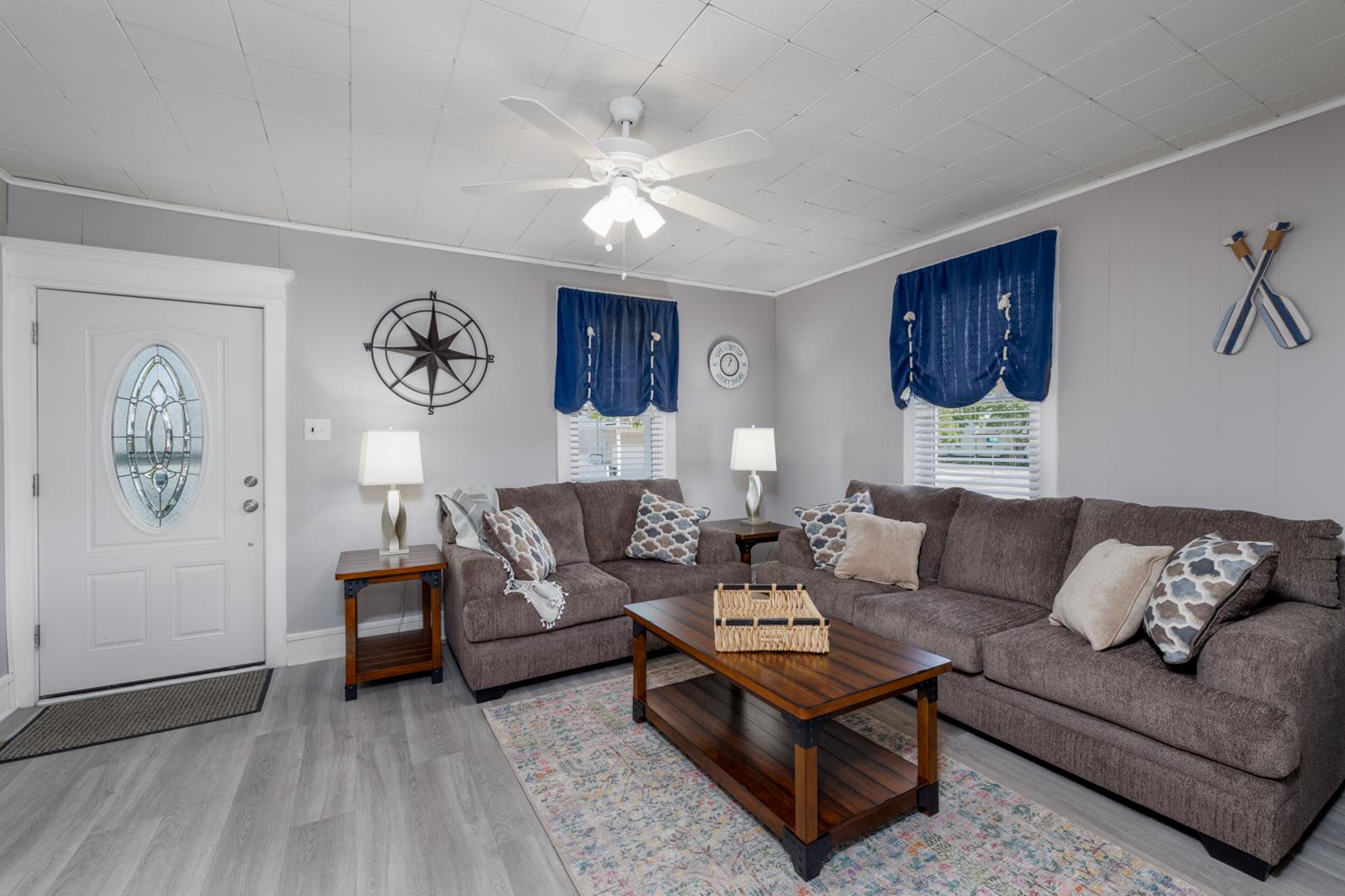 As you step inside, you'll find a well-equipped kitchen with modern appliances including a dishwasher, microwave, coffee maker, toaster, and blender. The central AC and ceiling fans throughout the property ensure a cool and comfortable stay, while the gas heat keeps you warm on cooler evenings.