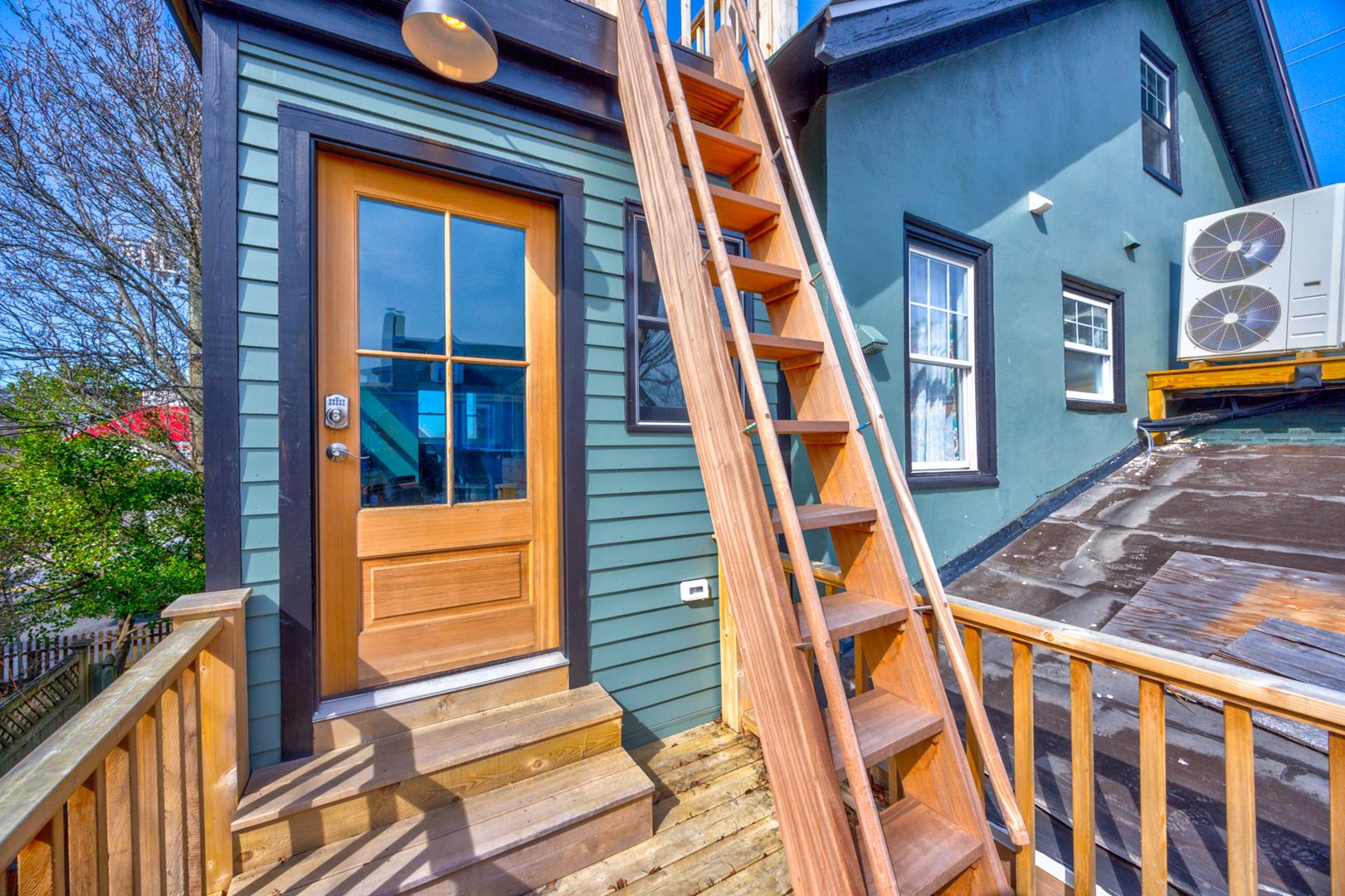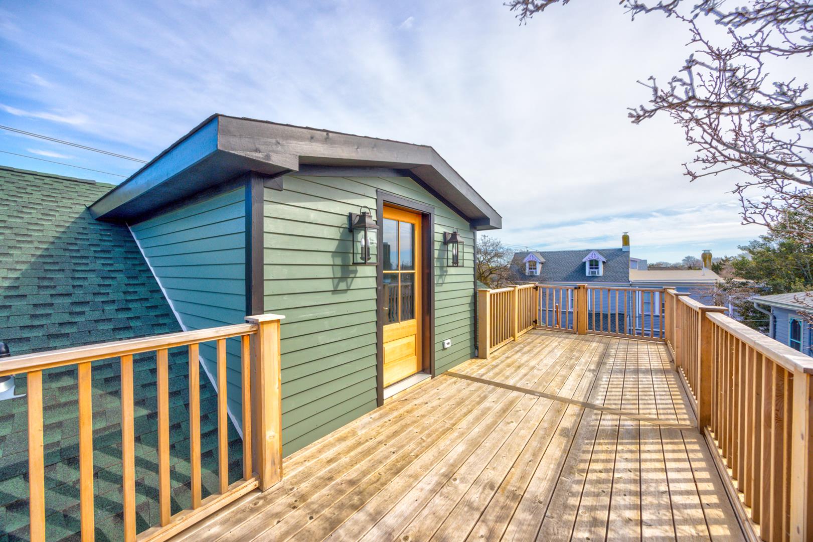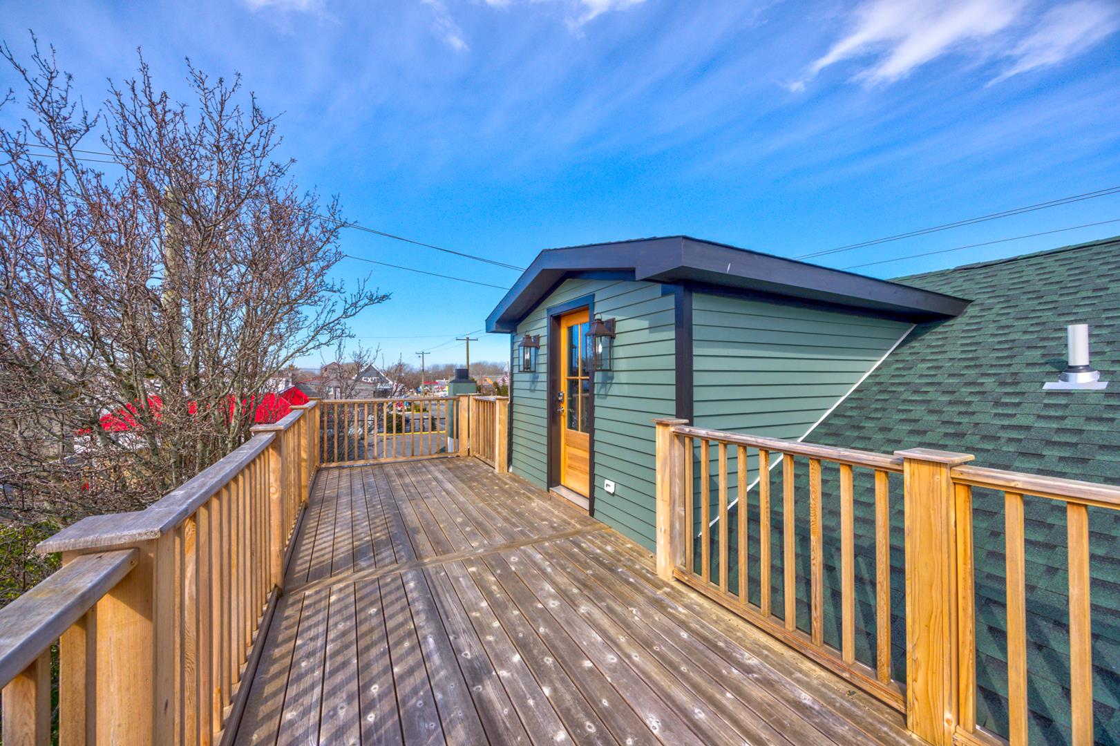 Second Floor: Private master suite with Queen bed, full bathroom with shower, sitting area with Full sofa-sleeper and streaming-enabled TV, and a spacious deck with stunning Cape May views.