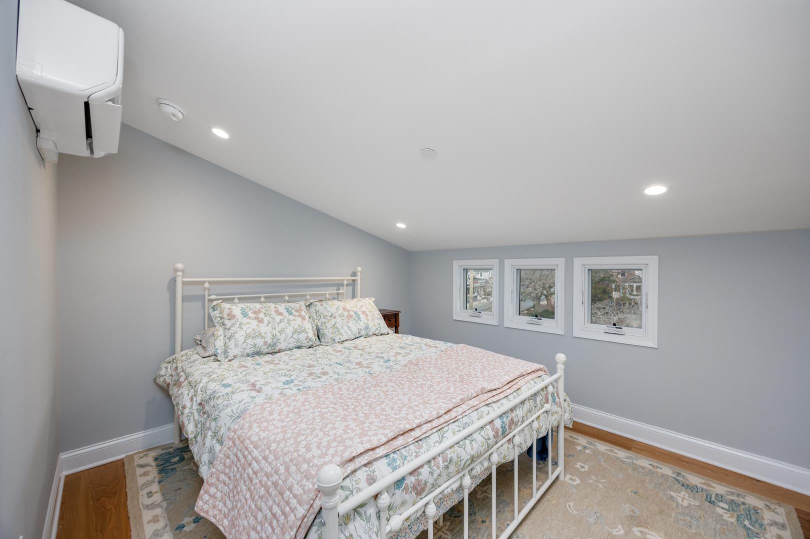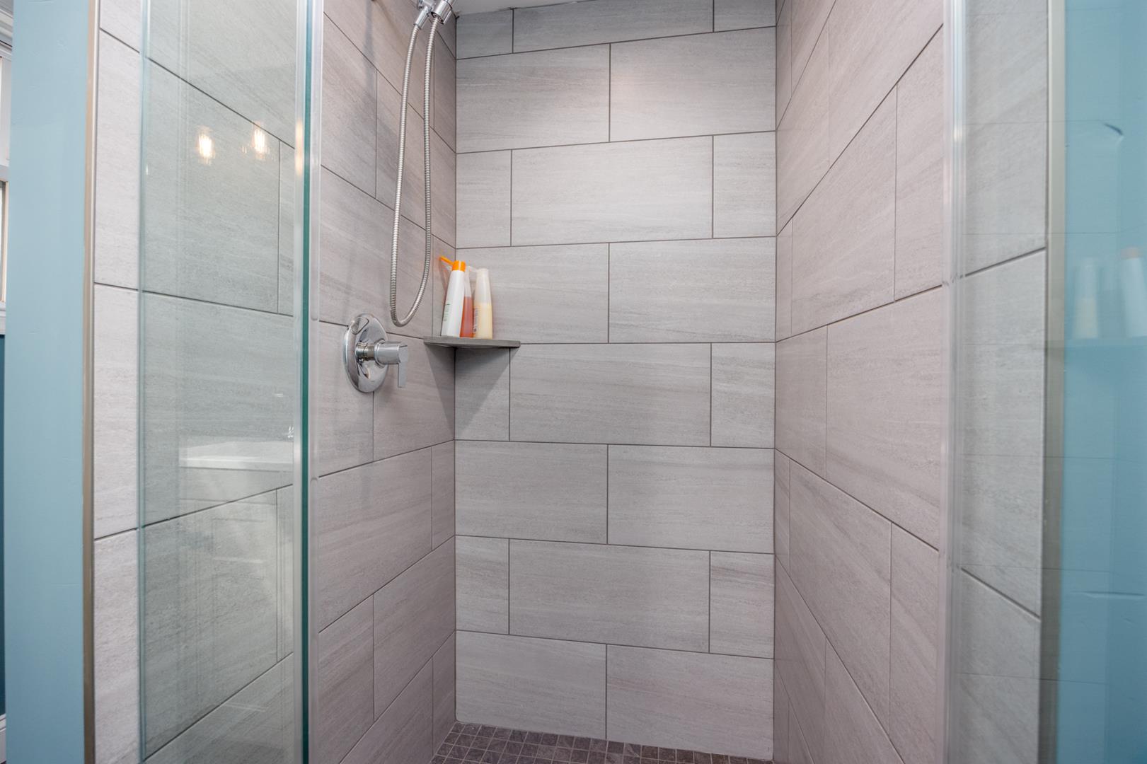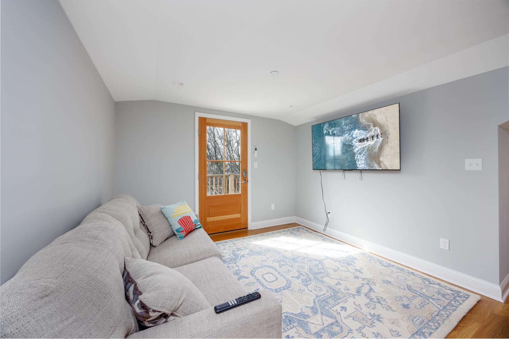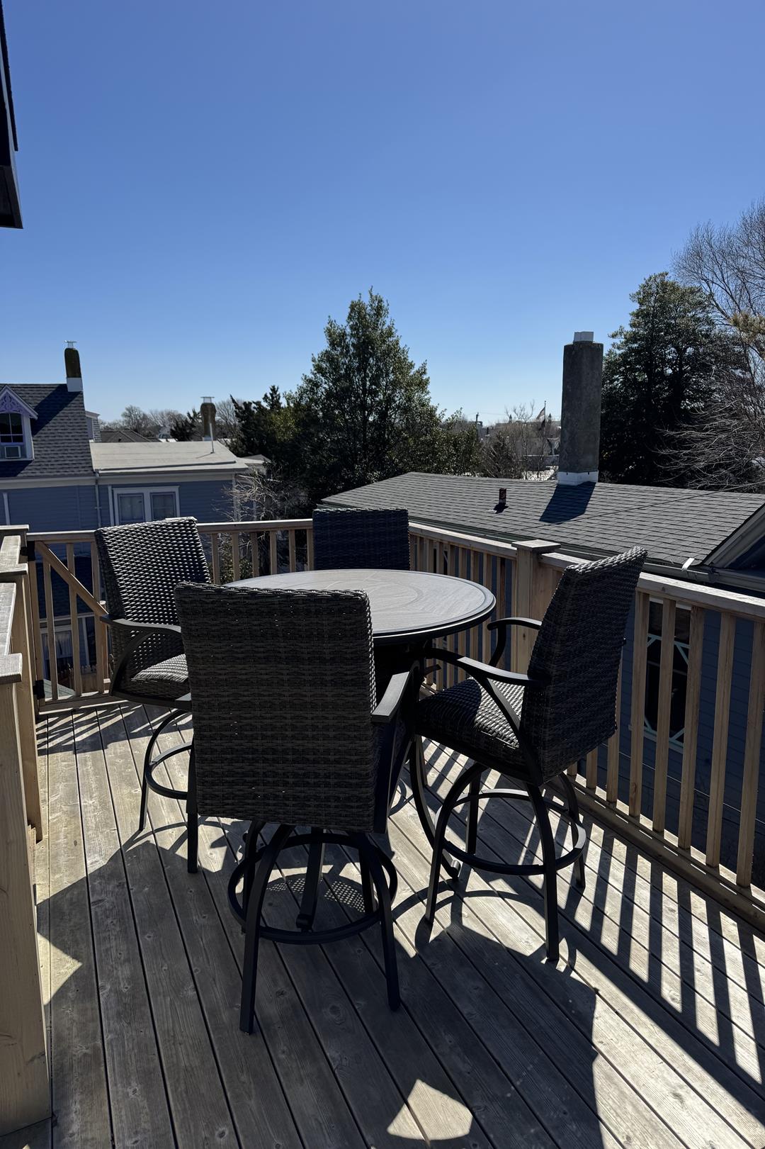 Second Floor: Private master suite with Queen bed, full bathroom with shower, sitting area with Full sofa-sleeper and streaming-enabled TV, and a spacious deck with stunning Cape May views.