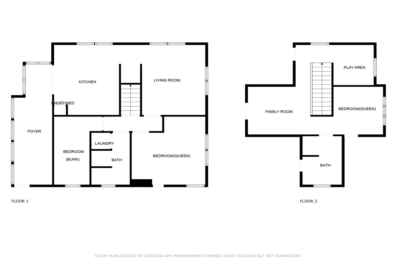 First Floor eat-in kitchen, living room with Queen pull-out sleeper sofa and streaming-enabled TV, master bedroom (Queen bed + seating area), second bedroom (twin-over-twin bunk bed with twin trundle), full bathroom with shower, and an office nook with desk.