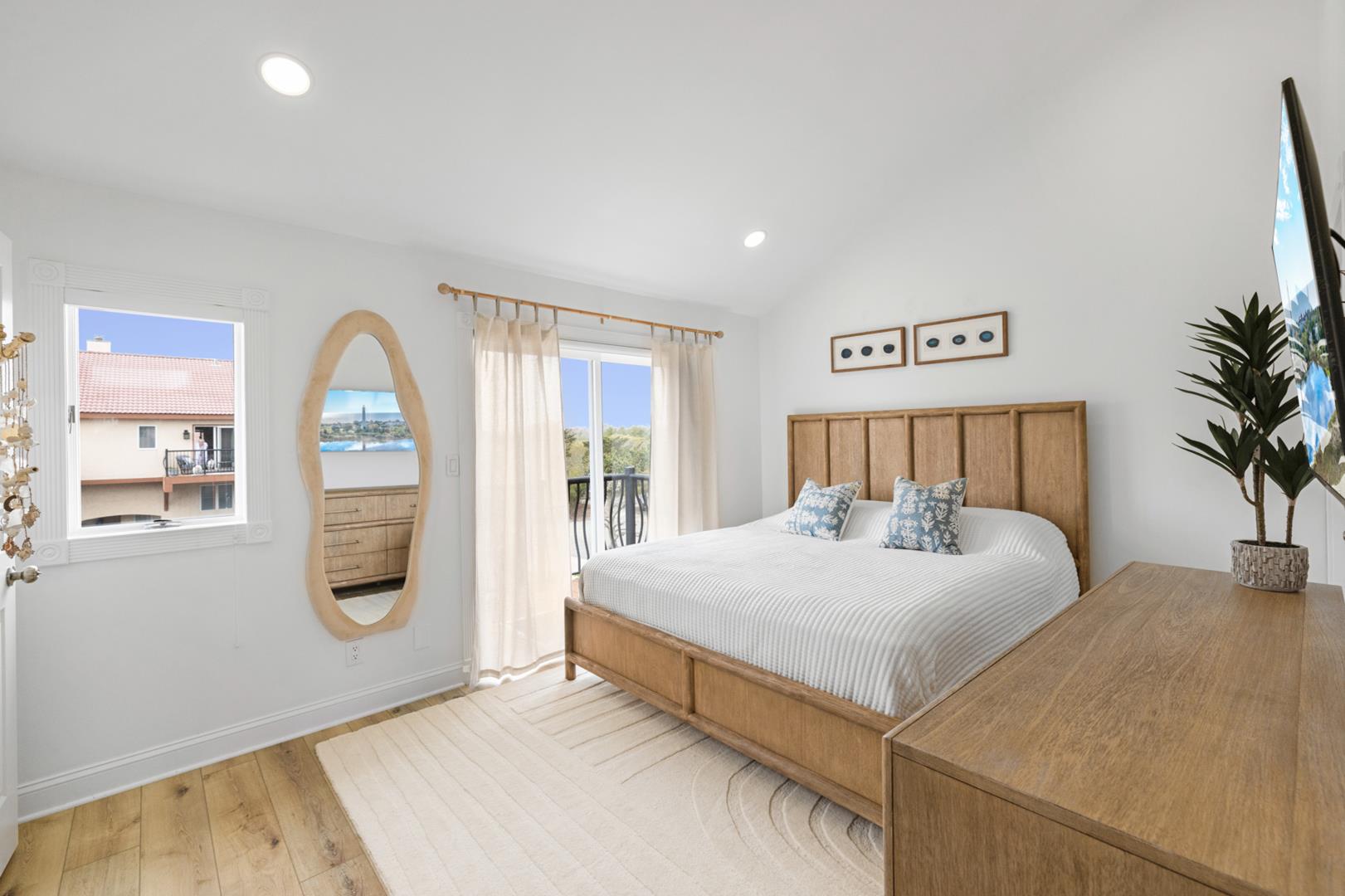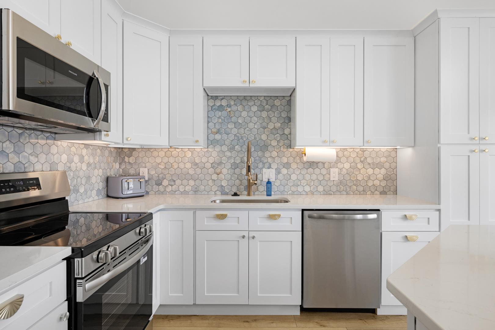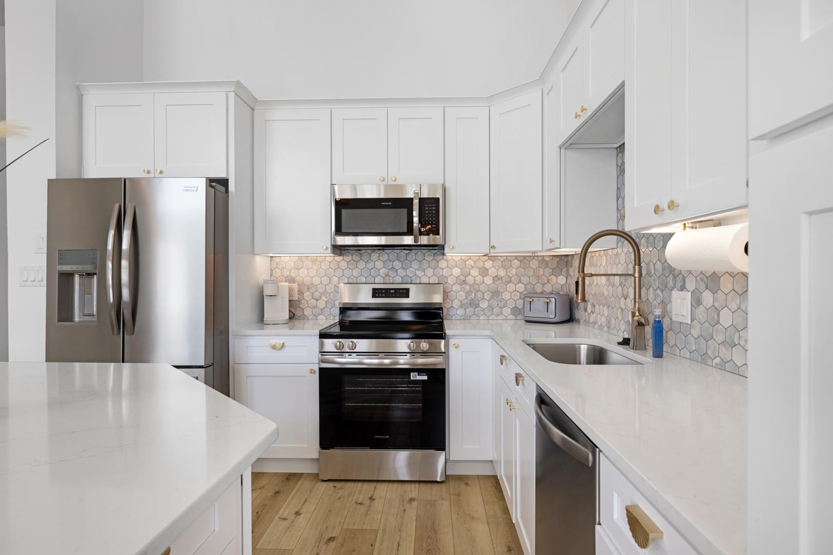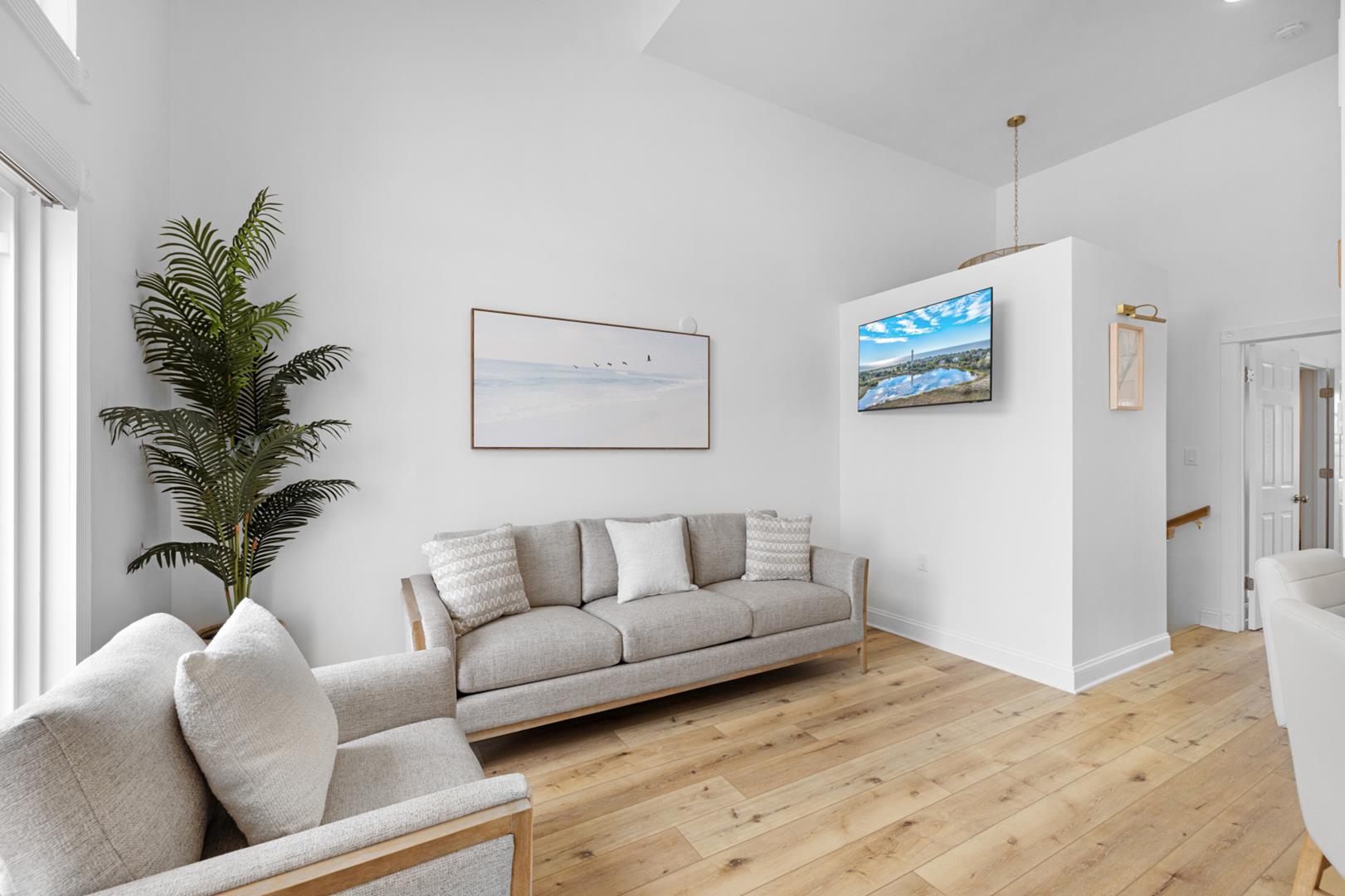 Inside, you'll find a fully equipped kitchen with modern appliances including a dishwasher, microwave, coffee maker, and toaster. The central AC and ceiling fans will keep you cool on hot summer days, while the gas heat will keep you warm on cooler evenings. Other amenities include a washer, dryer, vacuum cleaner, Smart TVs, and free WiFi.
