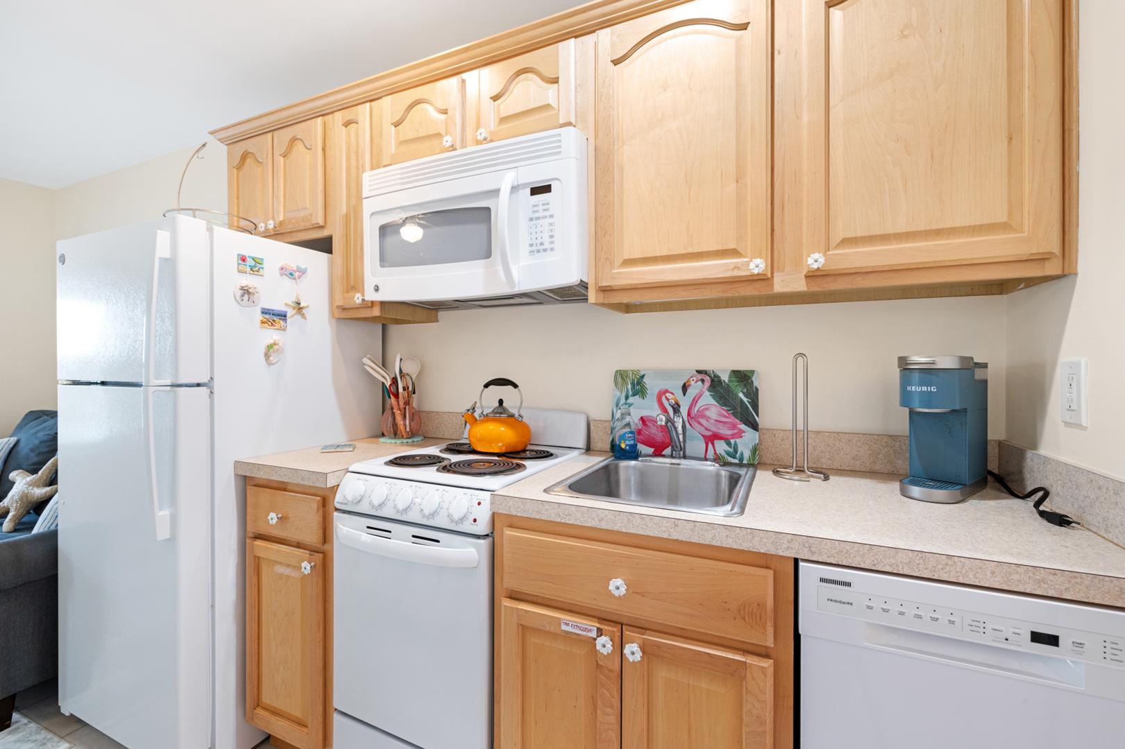 As you step inside, you'll find a cozy living space with 1 Queen Bed and 1 Sofa Bed, ensuring a good night's sleep after a day of fun in the sun. The fully equipped kitchen features modern amenities such as a dishwasher, microwave, coffee maker, and toaster, making meal preparation a breeze.